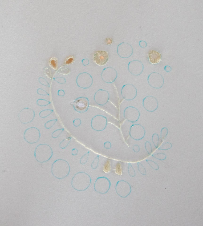The thread is DMC écru Moulinè Special and I don’t think there will be any love lost between me and this thread. It’s a stranded embroidery floss but it’s weak and fluffy and horrible. The stem stitch in the piece ended up looking very delicate but just so sad and lifeless. I have to admit it does have a good sheen on it but it is very prone to breaking and its furry, fluffy ways make it a pain the thread (unexpected issue of wearing a mask… how do you lick your thread ends?!)