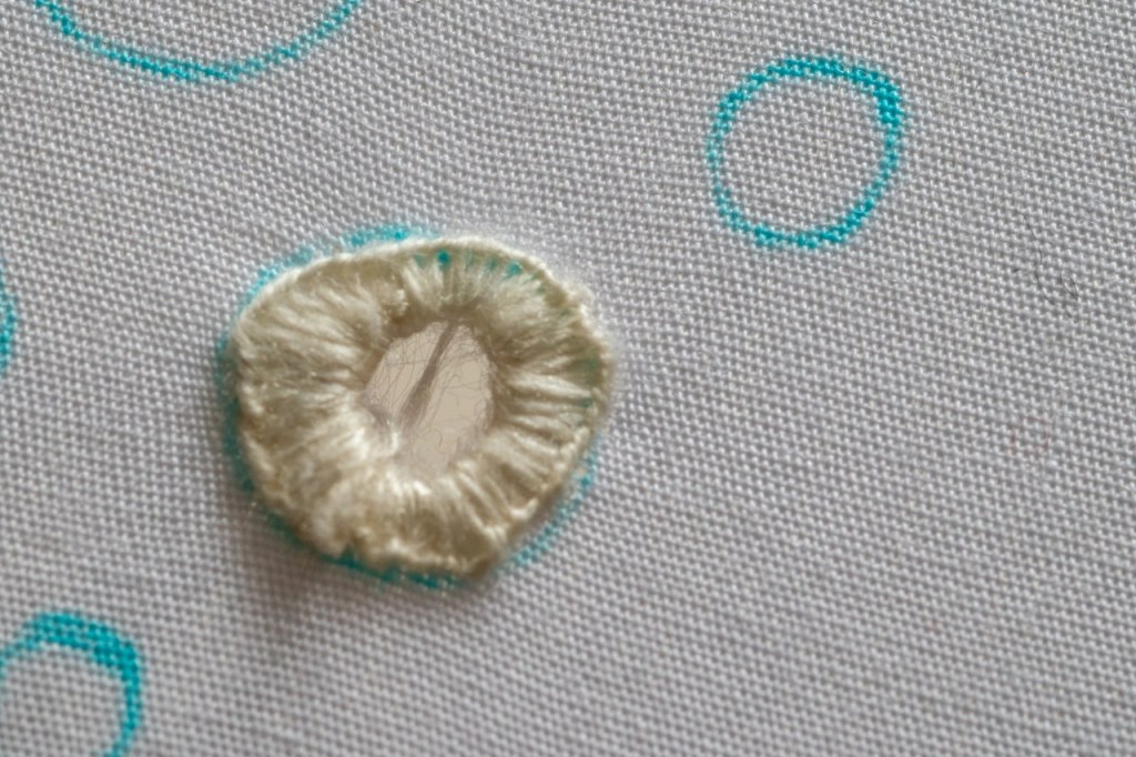 I think if I was transferring my own design for the larger circles I would have pre-drawn the lines for the inner rings because I was not great at drawing symmetric circles which shows on the final eyelet. That was a little bit of a shame as the first buttonhole eyelet was an unmitigated disaster but the second one had much better stitching but was just horribly misshapen because I didn’t do a very good job of putting the running stitch in at the centre.