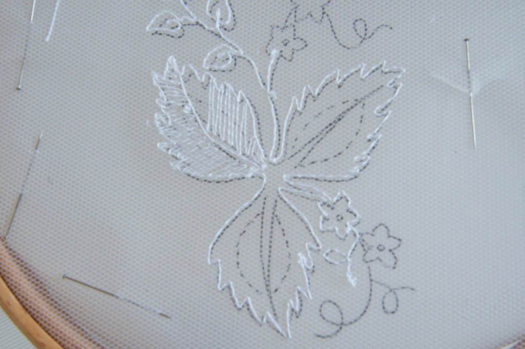 Outlining stitches are quite quick to work and satisfying, especially when you just hit the right combination to get exactly the edge you wanted on a leaf or petal and a bit less of a headache. I did experiment with being less rigid when I was working some of the filling about always going up and down through the net and I think it works quite well. My one dislike of the technique is that it is very easy for things to look ‘wobbly’ – creating curved lines isn’t too bad but sometimes it’s hard to get much variation in angle without looking like you are tracing the net in stepped sections. Think this is a technique that requires the right design.