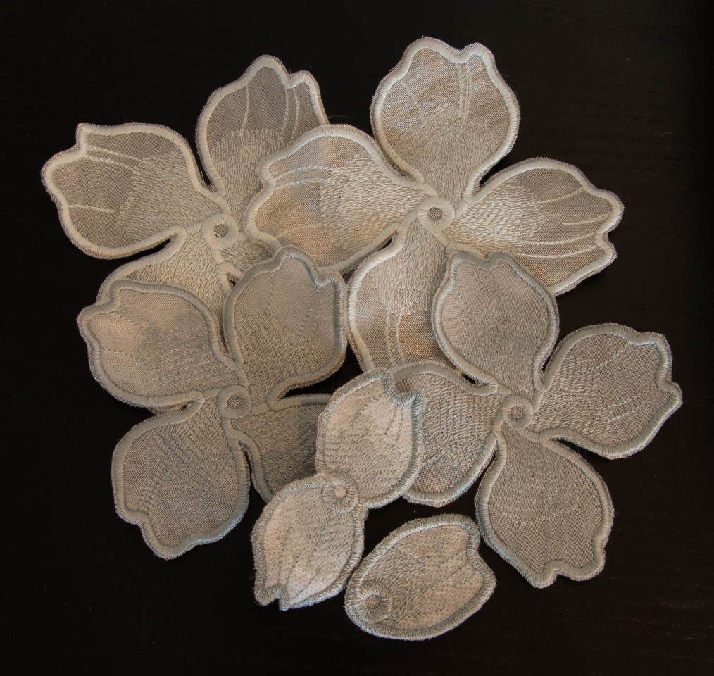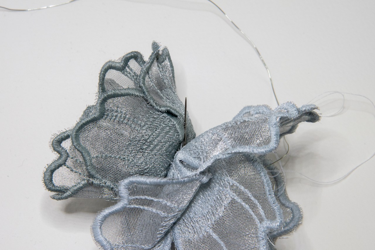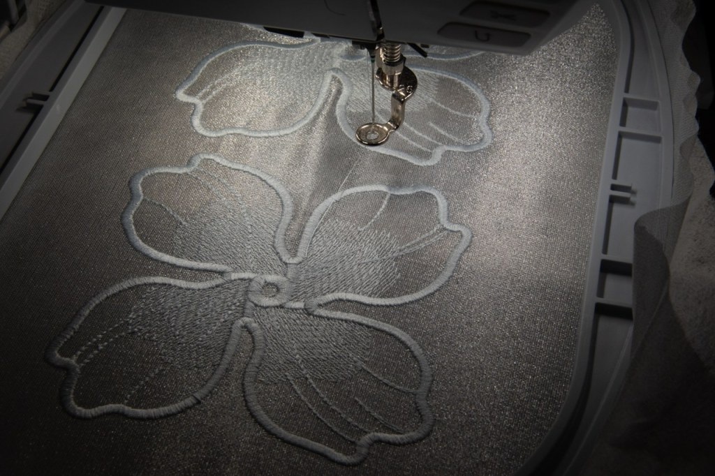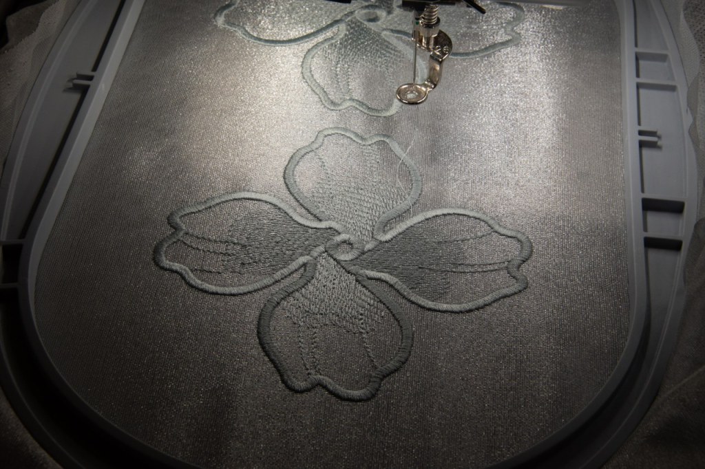 Then it was a case of threads and needles. Here, there was a contradiction between my favourite reference book and what was recommended by the Urban Threads site. The choice was either between a size 70 embroidery versus a size 75 sharp, which mentioned online. Not entirely sure what a Sharp is but the 70 Microtex worked beautifully. Good quality organza is not a material to be scared of it seems, just resist the urge to adjust it in the hoop or iron it too hot and it’s not nearly as delicate as it looks.