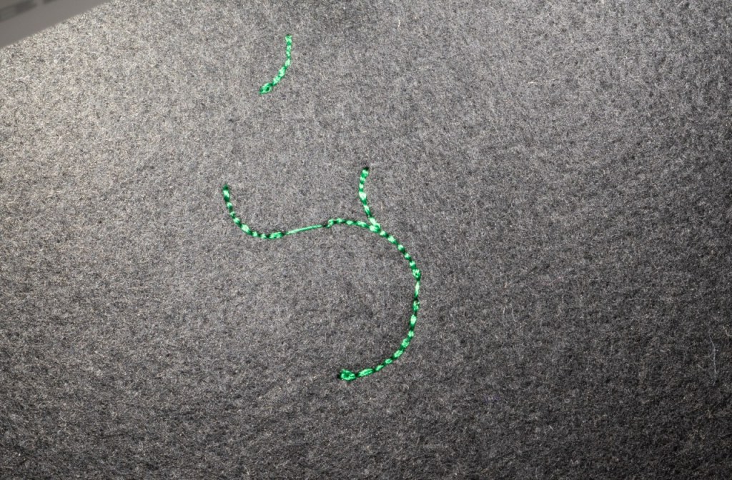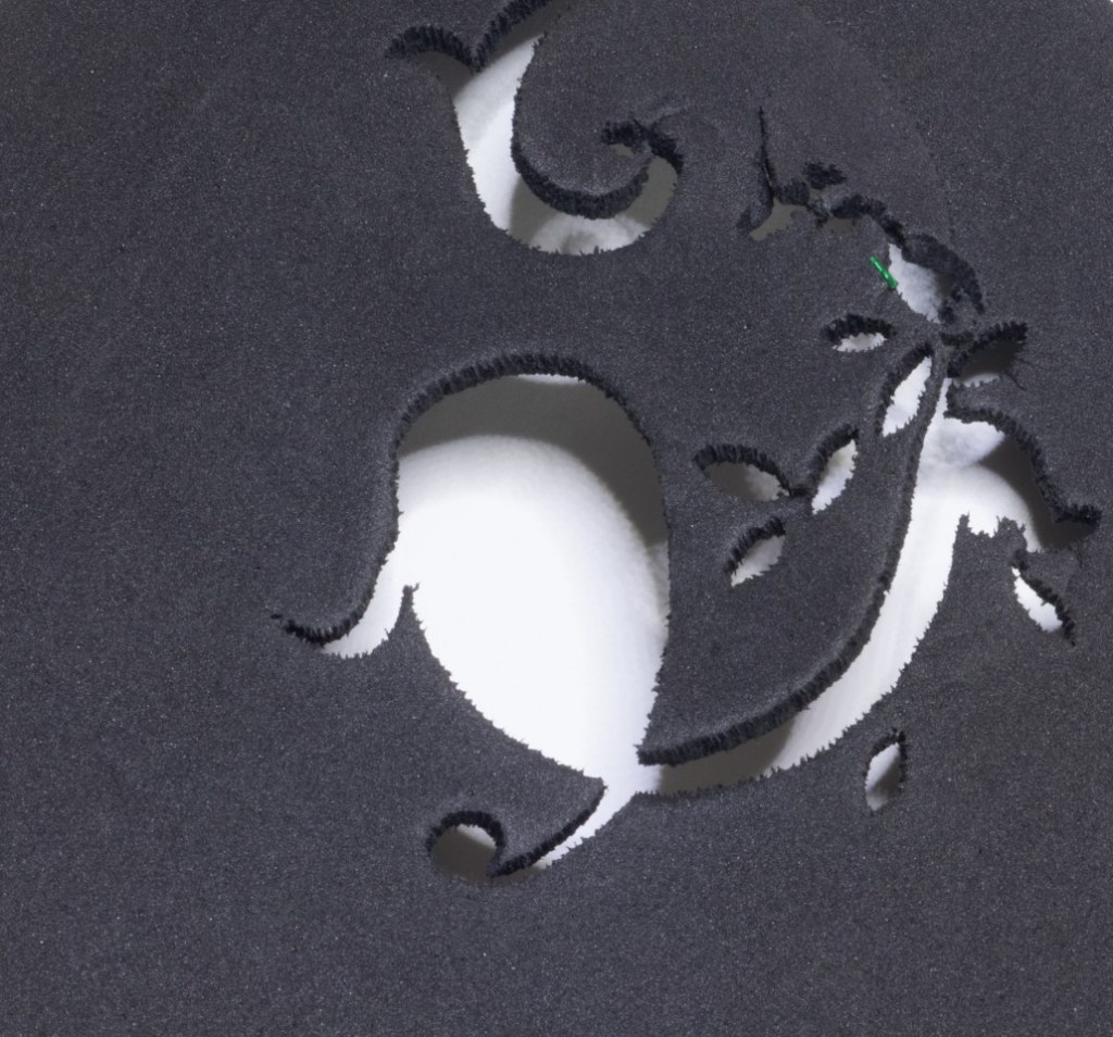 I’ve used 2 mm foam for this design which definitely gives it a very bold, raised look and I am pleased to report that it doesn’t slip badly on the felt at all. I probably shouldn’t admit this but I didn’t actually secure the foam in any way, just kept a gentle hand on the machine for the first few stitches. My first test design did go relatively smoothly but for reasons I don’t quite understand the machine registration decided to have a bit of a stutter, meaning that the design is misaligned in a section. I had thought those spiral shape (which are utterly awful to digtise without sending the stitch density off to ‘guaranteed bird nest’ levels) would be the problematic region but no, it just decided in the middle of what seemed like a smooth run to throw a tantrum. Still, this is why it was a test and I was happy to see most of the design worked out okay.