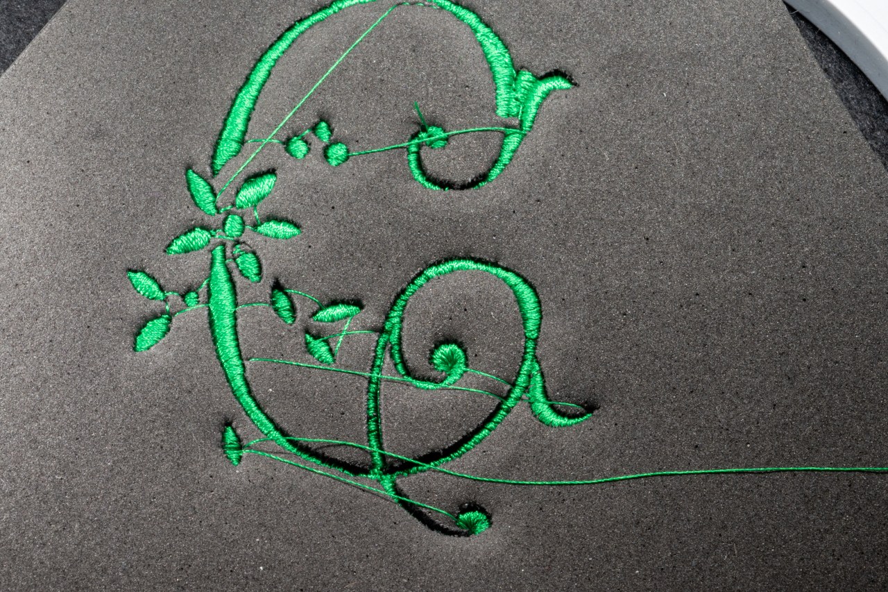 The design is an adaptation of one of Mary Corbet’s monogram collections. The small modifications were partly to make the design easier to stitch in a machine format but also to try and make it look more like a G… I’m still not completely convinced it does but at the same time I’m also not sure what other letter of the alphabet it could convincingly be either. I cut down on some of the embellishments but kept a few that I just ran as some running stitch before laying the foam on top for the real thing.