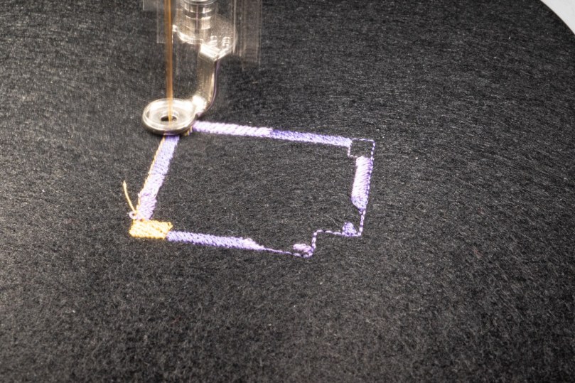 The hard part about getting the layout right was trying to account for the amount of pull there was going to be on the design with the stitching. The ‘lead’ regions of the design are fairly hefty and there’s a lot of satin stitching so pull was going to be inevitable. The thick felt helps and perhaps I should have considered cutaway rather than tearaway stabiliser but overall I was only a few mm off in my adjustments. Some of that was probably mounting errors trying to get the fabric into the card!