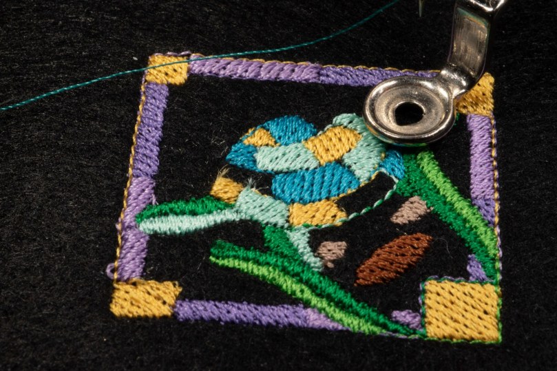 Apart from the few machine snags, particularly on the antenna of the various critters, I really did enjoy this one. I like the silver for the ‘lead’ structures on the black background – it gives the impression of an inverted stained glass in some ways. Rather than having a light fabric to let some actual light through broken up by heavy dark lines, instead it’s on a dark fabric background and you have almost highlights in the colours. Some of the thread fill effects are nice as well – better than flat satin everywhere. It’s so hard to get smooth decently dense satin on the machine that I love the patterned and textured tatami-type fills.