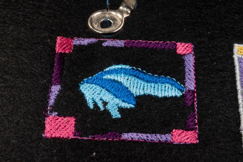 I did need to rescale them but a few per cent to get the dimensions right, which was unfortunately enough to make the stitch density sufficiently irritating for the machine it had a few temper tantrums getting through one of the regions. Normally resizing within 10 % should be ‘within tolerance’ – what you don’t want is stitches getting below the hard stitch size limit of the machine, usually about 1 mm. I’m always a bit annoyed when other people’s designs don’t stitch well, I feel other people should be able to do a much better job than me!