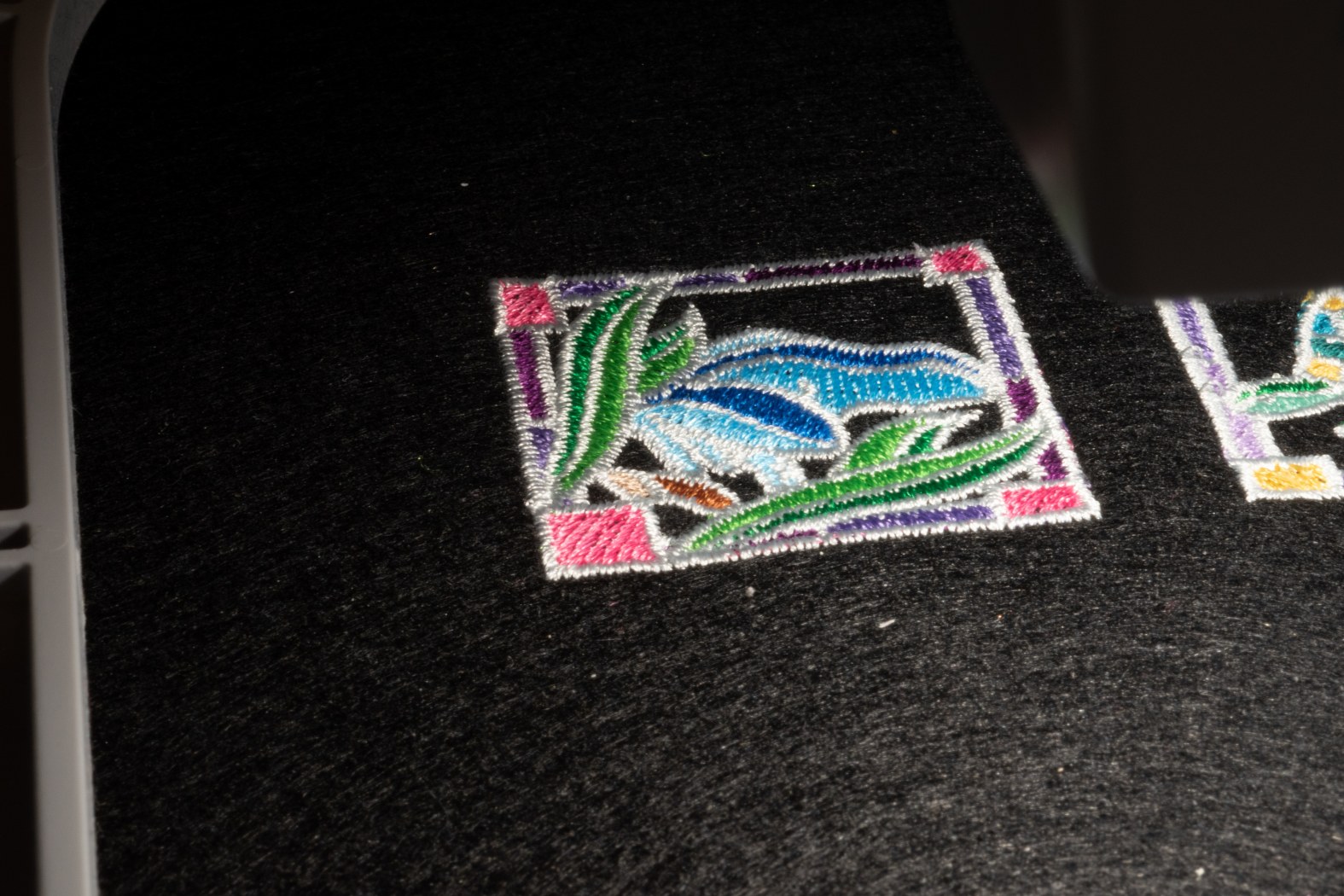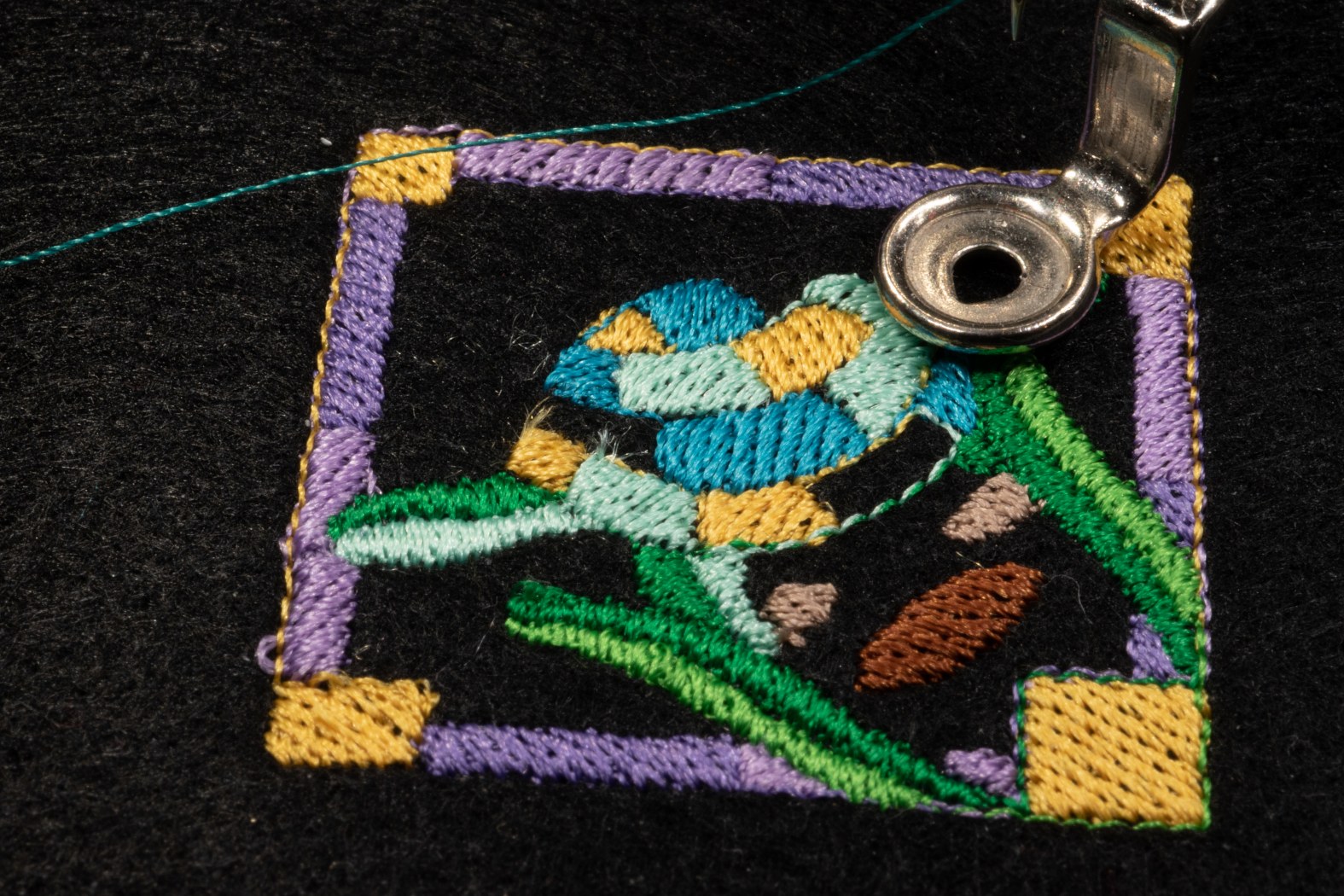 Apart from the few machine snags, particularly on the antenna of the various critters, I really did enjoy this one. I like the silver for the ‘lead’ structures on the black background – it gives the impression of an inverted stained glass in some ways. Rather than having a light fabric to let some actual light through broken up by heavy dark lines, instead it’s on a dark fabric background and you have almost highlights in the colours. Some of the thread fill effects are nice as well – better than flat satin everywhere. It’s so hard to get smooth decently dense satin on the machine that I love the patterned and textured tatami-type fills.